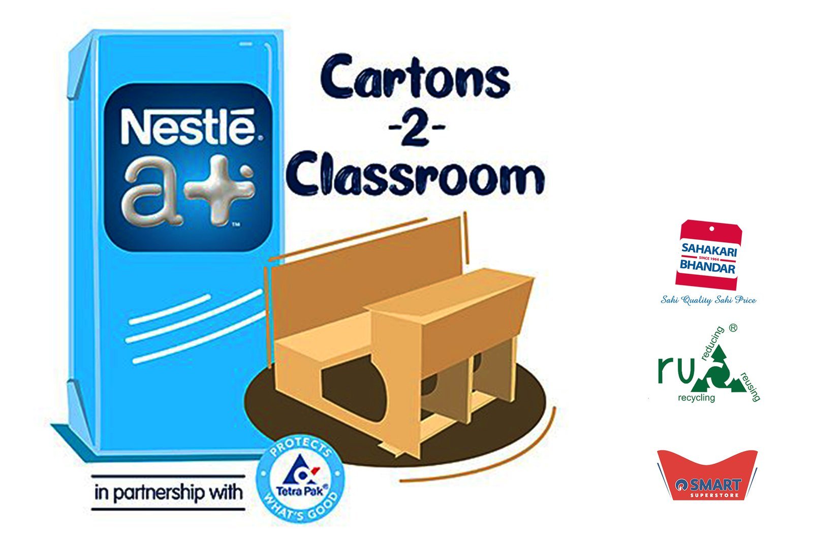 The beverage cartons such as the ones made by Tetra Pak, are paper-based, recyclable and can be converted into useful items like classroom furniture. With an intent to make this initiative accessible to all Nestlé a+ consumers they set up 54 collection points across Reliance Smart Superstores and Sahakari Bhandar outlets throughout Mumbai. Nestlé a+ aims at collecting more than 10,00,000 cartons which would get recycled into composite sheets and almost 100+ desks for schools.