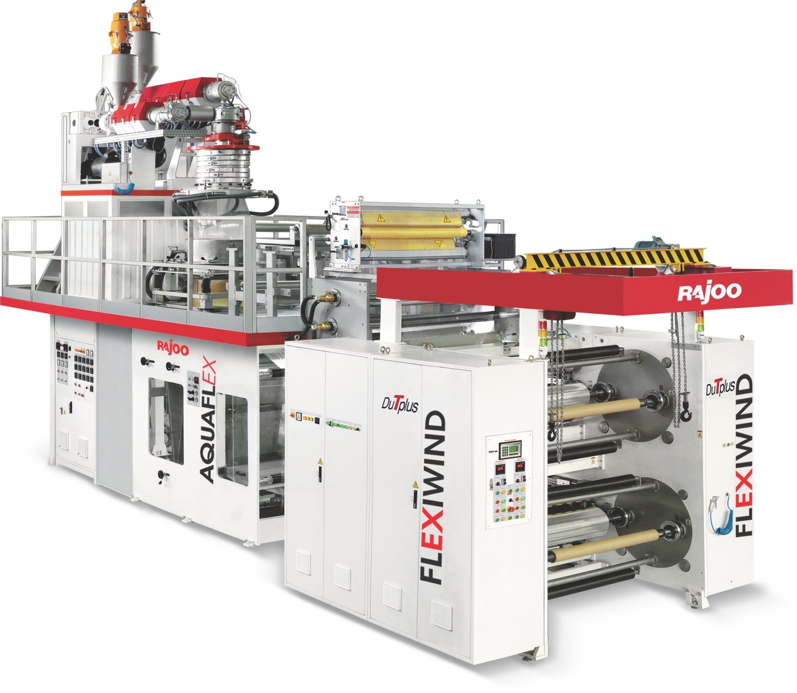 AQUAFLEX opens up a range of completely new packaging solutions, including 3-layer PE or PP products for medical applications as well as 5and 7 barrier films for optimum thermoforming and sealing characteristics. The AQUAFLEX – downward blown film lines are available in multilayer configuration to produce a substitute for less stringent applications of BOPP and CPP films. With the core layer of sealant polymer grade, the outer layer could be of a designer resin grade or a simple homopolymer for achieving the appropriate property mix. AQUAFLEX is available in up to 7 layer configuration to produce variety of films with output of upto 400kg/hour including asymmetrical film structures with nylon.