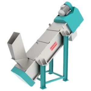 The friction washer is made of a cylindrical trough with an inclined high speed running paddle screw to dewater and clean ground material (film flakes, granules and similar material).