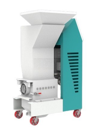 Beside-The-Press Series granulator are ideal for the processor who has small injection molding machines and wants a lot of value in a small package. This quiet, energy efficient granulator conserves valuable floor space while producing quality regrind from robot-fed sprues, runner and small parts. All models feature tangential feed, case hardened cutting chambers, low-speed motor and staggered rotors with replaceable cassette knives. The staggered rotor design produces more cuts per revolution, resulting in higher throughput. Smaller bites reduce the chance of jamming or shearing. The scissor cutting action of slanted rotor knives produce superior quality regrind. The staggered rotor combined with a low-speed motor, offers cleaner, quieter cutting and uses less energy.