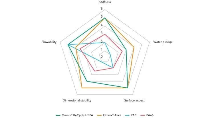 Solvay’s =”https://www.solvay.com/en/brands/omnix-hppa/omnix-recycle-hppa”>Omnix® ReCycle can be processed on standard injection molding equipment, including the use of water-heated molds. Following the successful sampling and approval by selected customers, the new sustainable HPPA material is commercially available, world-wide.